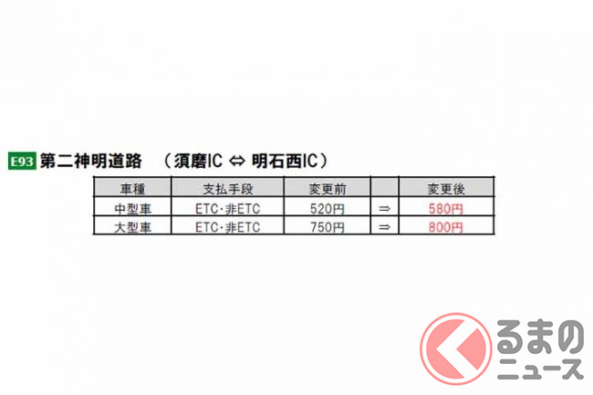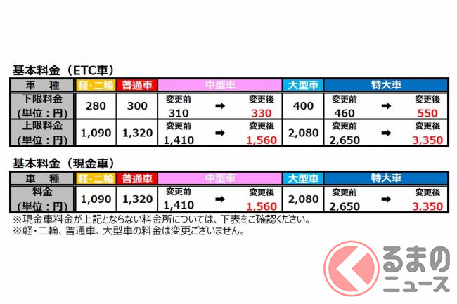 これにより、5車種の基本料金が、一般的な高速道路の大都市近郊区間の料金水準に整理・統一されることになります。