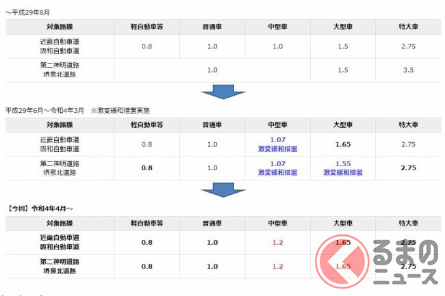 阪神高速は、2017年6月に車種区分をそれまでの2つから5つに分けました。その際に、中型車と特大車については急激な値上げをなるのを防ぐため、2022年3月末を期限とした激変緩和措置を導入していました。