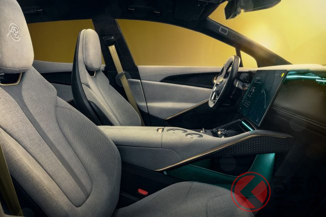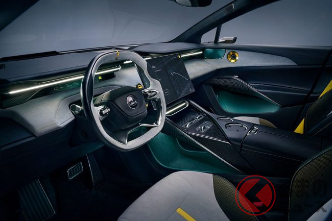 インテリアはロータスの軽量化哲学に基づいてデザインされ、室内で使われるカーボン素材は、リサイクルされたものが使われています。センターコンソールには15.1インチタッチディスプレイが備わります。