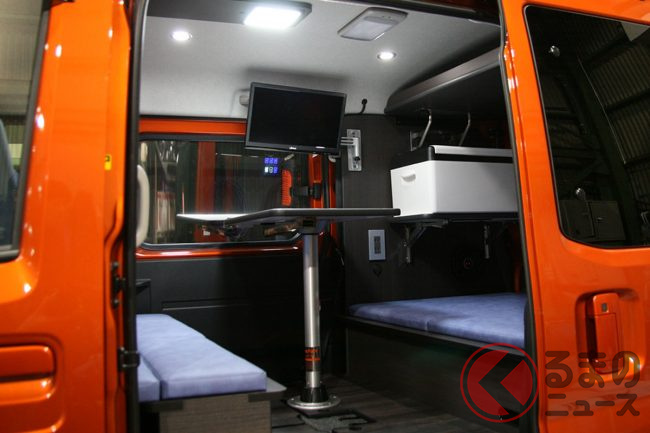 今回発表されたキャビンIIミニベースは、乗車人数は4名、就寝人数は2名で、標準装備には、センターテーブルや16型テレビモニター、LEDの室内灯、フロント・リア両方にドライブレコーダーなどが備わっています。