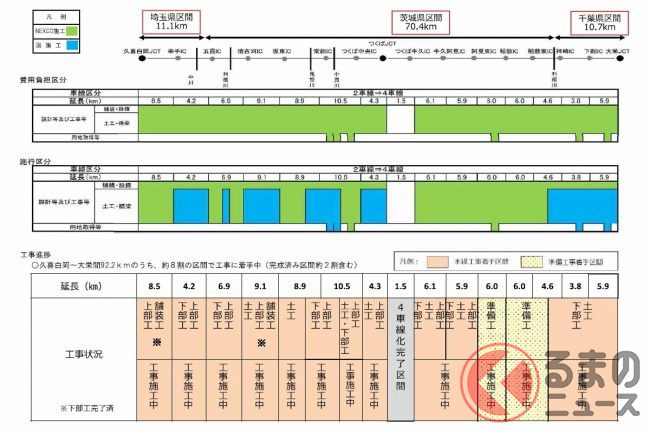 このうち、久喜白岡JCT~幸手IC間8.5kmと境古河IC~坂東IC間9.1kmは、2022年度末に4車線化される見込みです。
