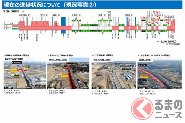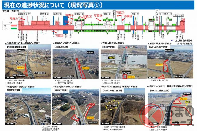 しかし一方で、五霞IC~境古河IC間、坂東IC~つくば中央IC間、牛久阿見IC~阿見東IC間、稲敷IC~神崎IC間の4区間は、2024年度までの4車線開通に影響が出ている状況といいます。