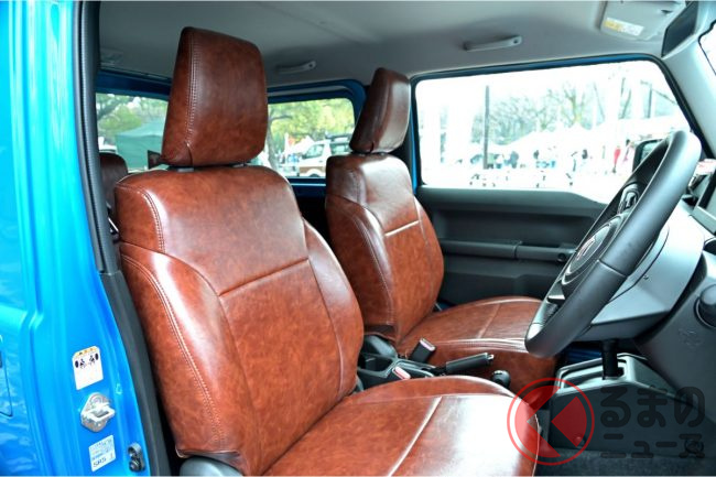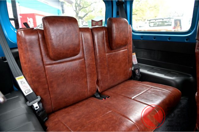 背面に備え付けられたラダーや小ぶりなルーフラックがアウトドア感をさらに盛り上げているほか、インテリアにはオリジナルのレザーシートカバーが装着されて高級感が溢れます。