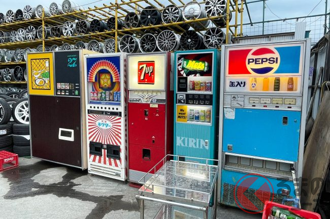中古タイヤ店ではこの自販機のほかにも、ペプシのロゴが大きく書かれた自販機やカレーの自販機など、日常ではもう見かけないようなレトロな自販機が並んでいます。