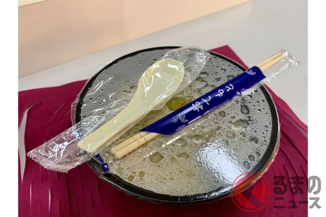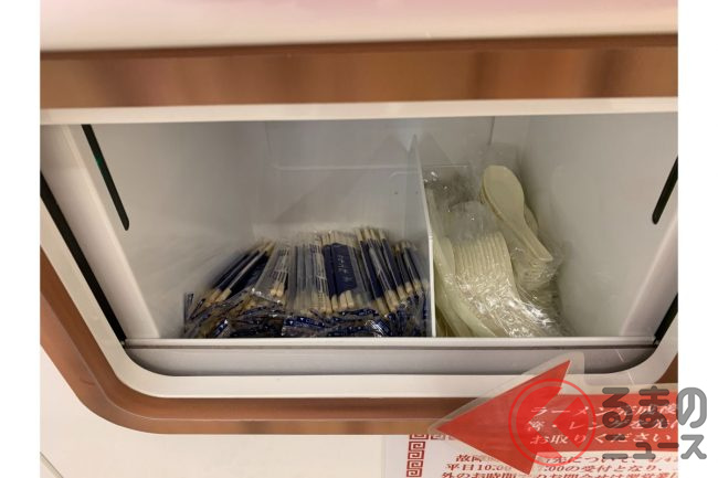 ここで注意しなくてはいけないのが、お箸とレンゲを取るタイミングです。ラーメンが完成して取り出し口が開くと同時に、その下にある扉が開いてそこにお箸とレンゲが現れます。この時に取ります。扉は自動で開いて自動で閉まるので、気づかない人もいるのでしょう。自販機の横に割りばしが置いてありました。