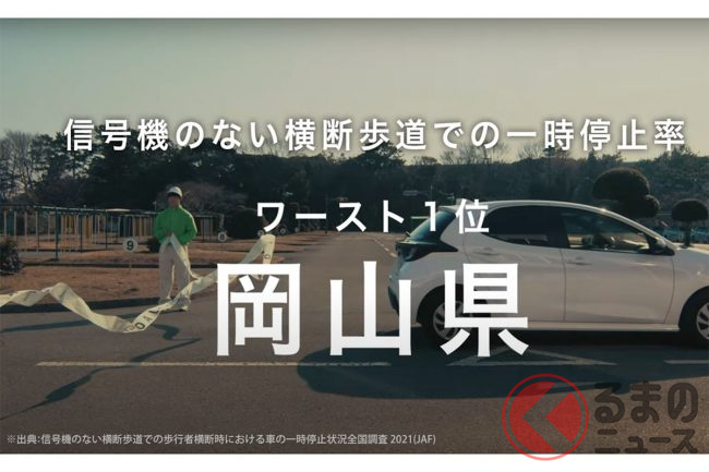 岡山県は、JAFがおこなった2021年の「信号機のない横断歩道での一時停止率」調査でワースト1位となりました。これは、一昨年2020年のワースト3位から降下する結果となっています。