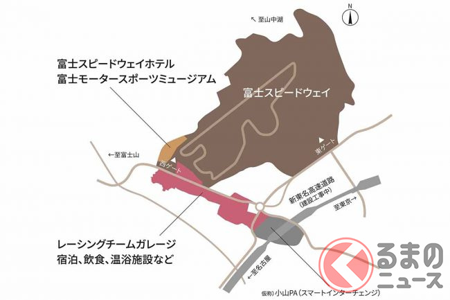 富士スピードウェイホテルと富士モータースポーツミュージアムは、2022年秋に開業予定。そしてレーシングチームのガレージなどが2023年以降、順次開業予定です。