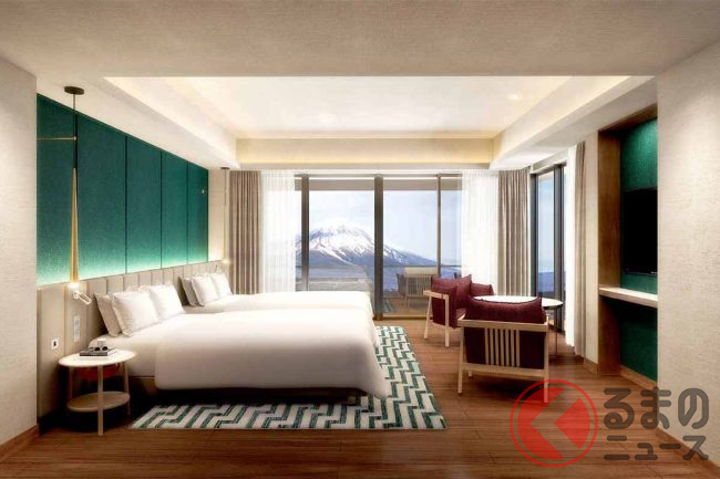 ホテルは、日本初上陸ブランド「アンバウンド コレクション by Hyatt」として、全120の客室を有する「富士スピードウェイホテル」が開業します。客室の窓には、富士山の姿とともにサーキットが広がります。