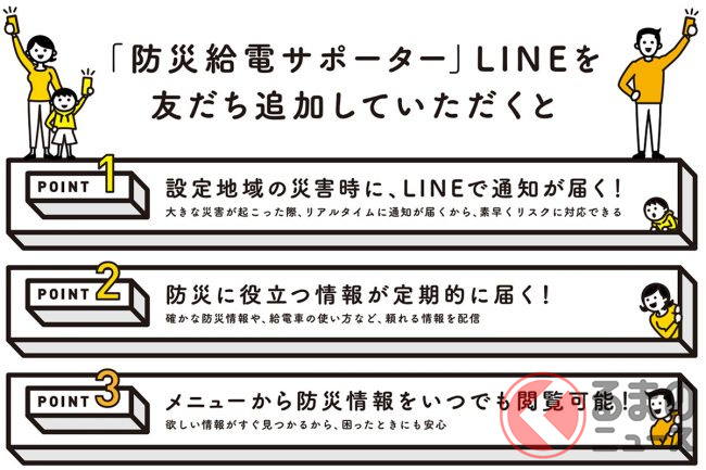 防災給電サポーターは、無料で役立つ防災情報を発信しているLINEアカウントです。「友だち追加」すると防災情報が送られてきます。