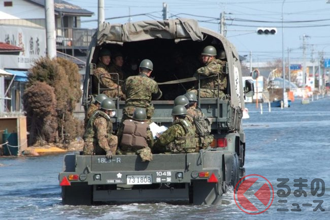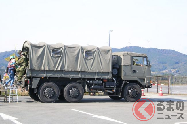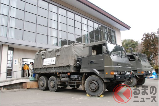 「荷台に人が乗って走破OK!」ただの「トラック」じゃない! 自衛隊の「3トン半」は「物資だけじゃなく安心」も運ぶスゴいヤツ!