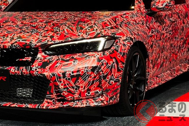 東京オートサロン2022で世界初公開された新型シビックタイプR(プロトタイプ)は、赤い「R」ロゴがデザインされたカモフラージュ柄を身にまとって登場。