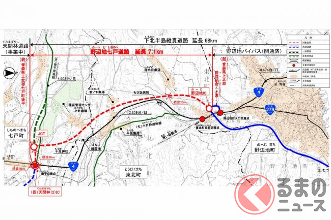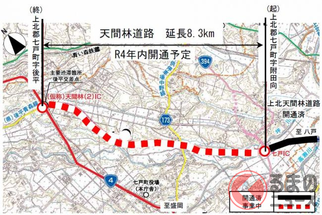 天間林道路は、現在の上北道の終点・七戸ICと、天間林(2)IC(仮称)間を結びます。
