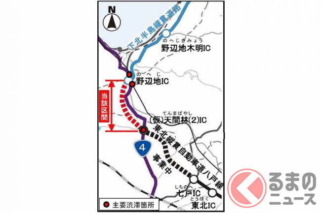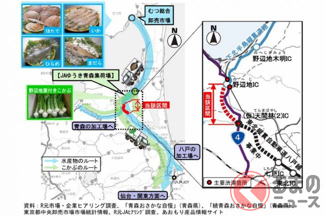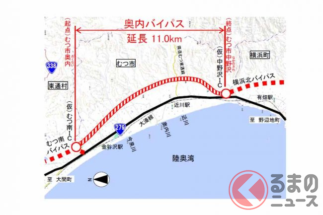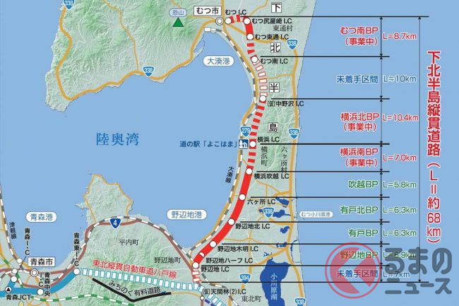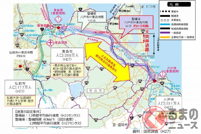 国土交通省東北地方整備局によると、この区間ができることで上北道が全線開通し、青森市~八戸市の所要時間が92分まで短縮される見込みです。