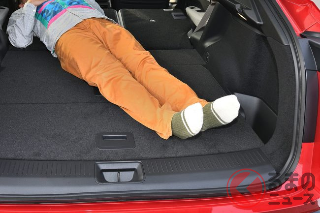 実際に後席シートを倒して寝転んでみると、身長170cmの成人男性の場合、バックドアが閉まる位置に足を置くと、頭が後席の足元スペースに若干落ちる形となりました。