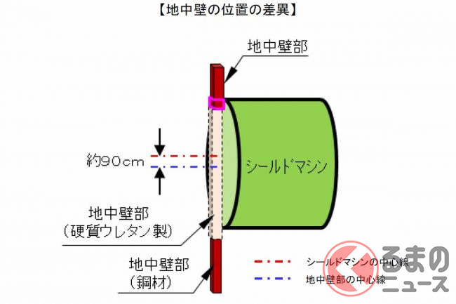 原因については確認中といいますが、地中壁の設置された位置が設計値よりも下に約90cm、水平方向に約10cmずれており、このためカッターが鋼材に接触したことが判明しています。