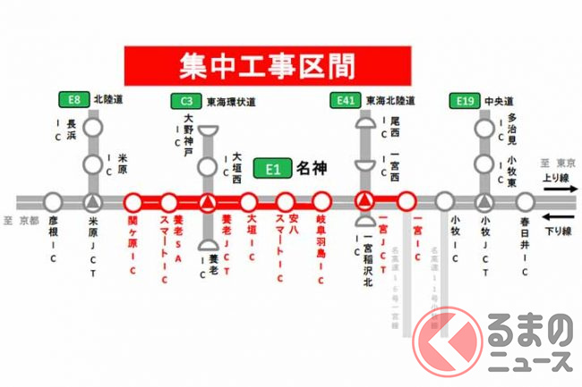 NEXCO中日本名古屋支社は2022年4月14日、名神高速の一宮IC~関ヶ原IC間で、昼夜連続の車線規制を伴う集中工事を実施すると発表しました。