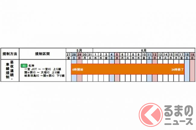 期間は、5月28日0時から6月17日24時までの21日間。車線規制区間は次のとおり。