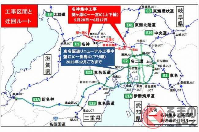 このためNEXCO中日本は、道路を利用する時間の変更や、伊勢湾岸道、新名神、名二環、名古屋高速などへの迂回、公共交通機関の利用の検討を呼び掛けています。