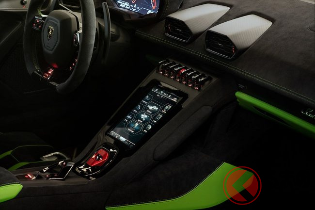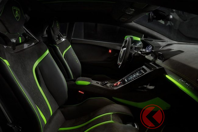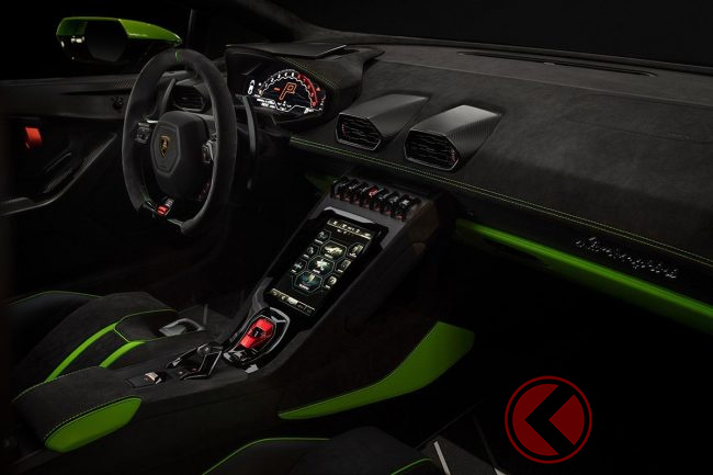 リアには固定式リアウイングを採用。ウラカン・エボRWDと比較した場合、リアのダウンフォースは35%増加し、空力は20%の低減を実現しているといいます。これにより、空力バランスの向上に加え、ブレーキ時やコーナリングでの安定性を確保しています。またアンダーボディにも新型のエアロディフレクターを採用し、空力効率の向上を図っています。