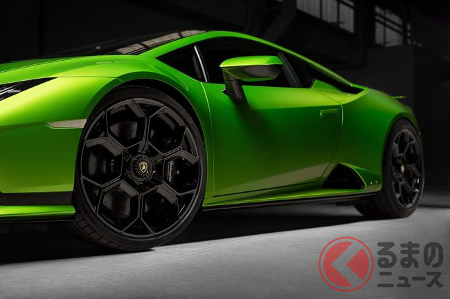 標準装着のアルミホイールは、ウラカン・エボRWDの前245/35ZR19、後305/35ZR19に対して、前245/30ZR20、後305/30ZR20と、1インチサイズアップしています。