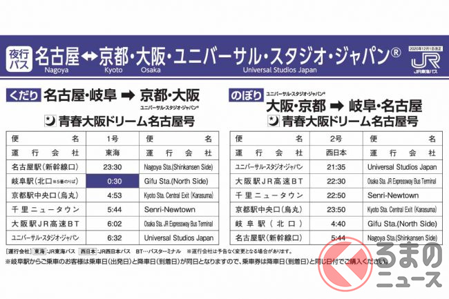 「青春大阪ドリーム名古屋号」の本数は1日1往復で、ジェイアール東海バスが下り便(名古屋発)、ジェイアール西日本バスが上り便(大阪発)をそれぞれ運行しています。