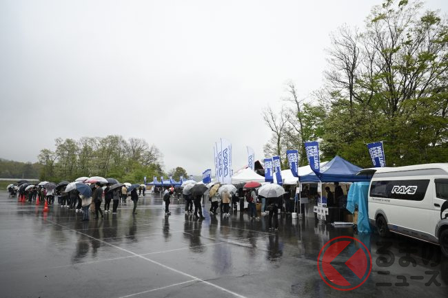 今回は500台限定のイベントとなりましたが、参加者の募集はスタートから瞬く間にエントリーが殺到し、予定を繰り上げて締め切るほどの盛況ぶり。当日はあいにくの雨模様となってしまいましたが、全国から自慢のRAYSホイールを装着した愛車たちが一同に会する姿は圧巻でした。