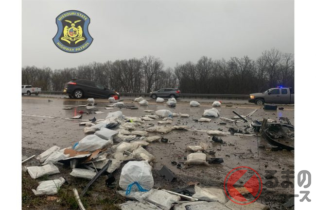 米ミズーリ州で交通事故が発生。事故対応でパトロール隊が現場に直行したところ、事故に遭ったクルマの荷物から超大量のマリファナの袋が散乱した、という珍事が、海外で話題になっています。