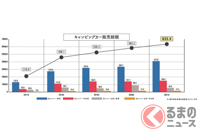 日本RV協会がまとめた「キャンピングカー白書2021」によれば、2020年の国内のキャンピングカー保有台数は約12万7400台。10年以上にわたって右肩上がりで、キャンピングカーの需要が増えていることが分かります。