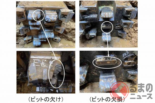 これにより、カッターの外周から約90cm部分にあるカッタービット222か所のうち、約3割にあたる76か所で損傷が確認されました。