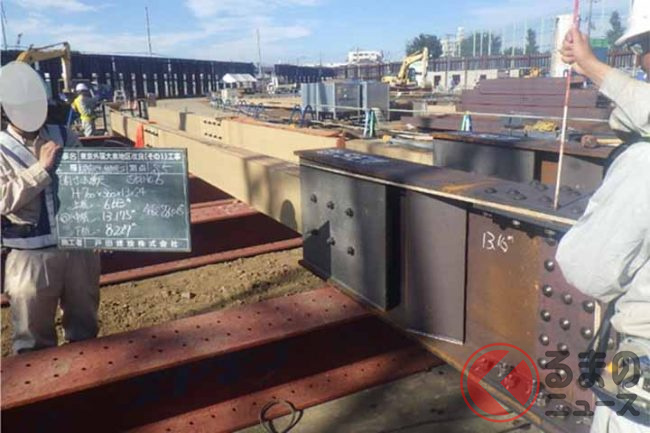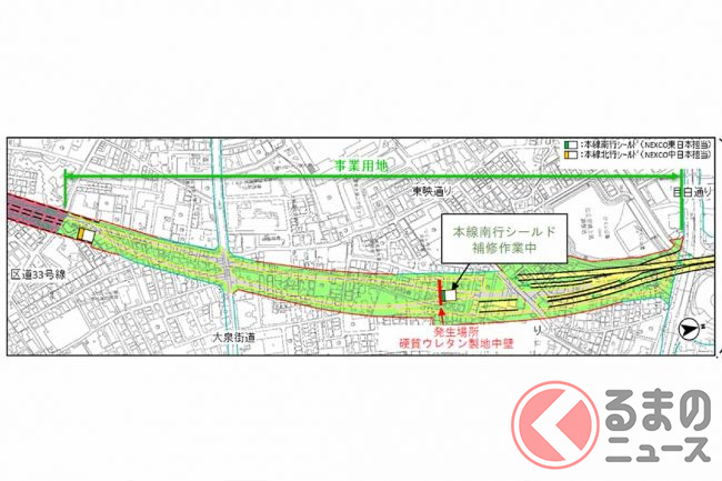 事故は4月7日に発生。直径16mほどのシールドマシンが外環道(関越~東名)の事業用地内で、大泉JCT(東京都練馬区)のランプと本線トンネルが合流する区間を掘り進めていたところ、マシン前面のカッターが鋼材に接触し、カッタービットと攪拌翼(土を攪拌する部品)が損傷しました。