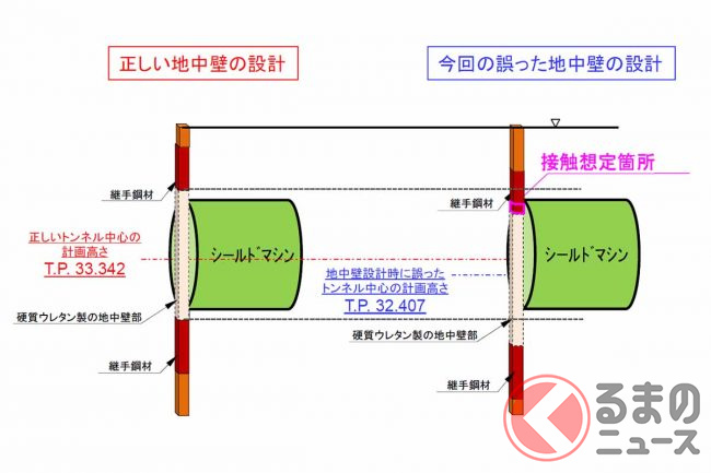 NEXCO東日本関東支社と国土交通省関東地方整備局によると、地中壁の図面を作成する過程で、受注者によるCAD操作上のミスにより本来の設計値からずれが生じ、誤りに気付かないまま施工されたということです。