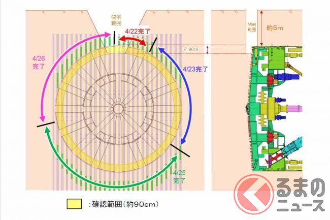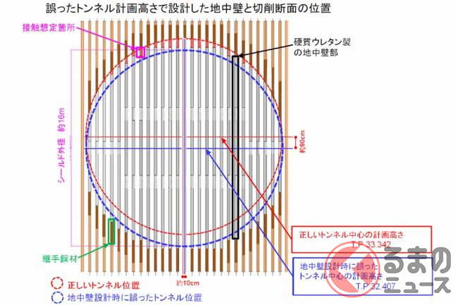 本来、シールドマシンは、止水用にあらかじめ設置していた地中壁のうち、円形の硬質ウレタン部分を切削して進む段取りになっていましたが、地中壁の位置が設計値よりも下に約90cm、水平方向に約10cmずれていたことが判明しています。