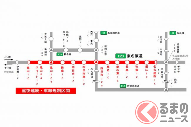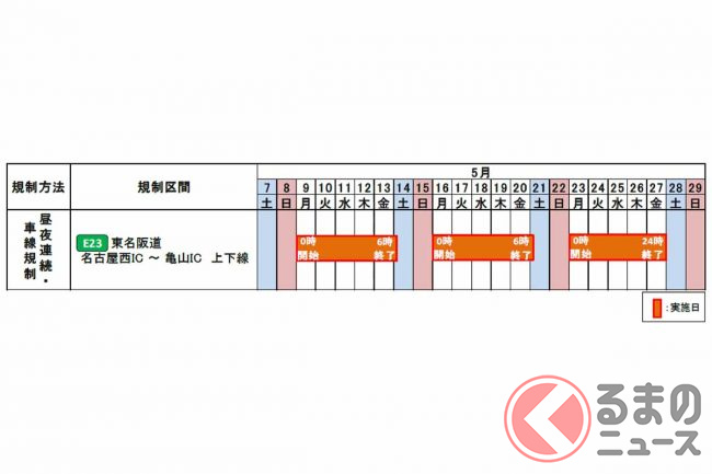 区間は名古屋西ICから亀山ICまで。期間は2022年5月9日から27日までです。ただし各週土曜朝6時から日曜夜24時までは、車線規制はおこなわれません。