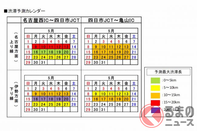 期間中は渋滞が予測されています。上り名古屋方面は最大16km、下り亀山方面は最大20kmです。
