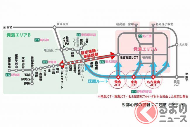 NEXCO中日本は、時差利用や伊勢湾岸道・新名神高速への迂回、公共交通機関の利用などを呼び掛けています。