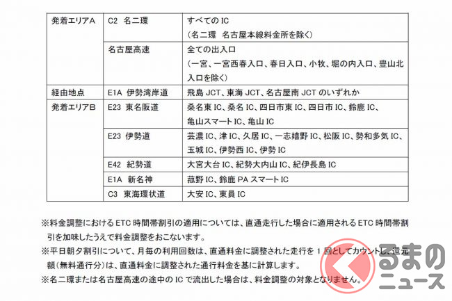 なお期間中はETC車を対象とし、名古屋高速や名二環と、東名阪道・伊勢道などとの間で、飛島JCT・東海JCT・名古屋南JCTのいずれかを経由して伊勢湾岸道・名二環などを利用した場合、東名阪道経由で直通利用した場合と同額になるように通行料金が調整されます(諸条件あり)。