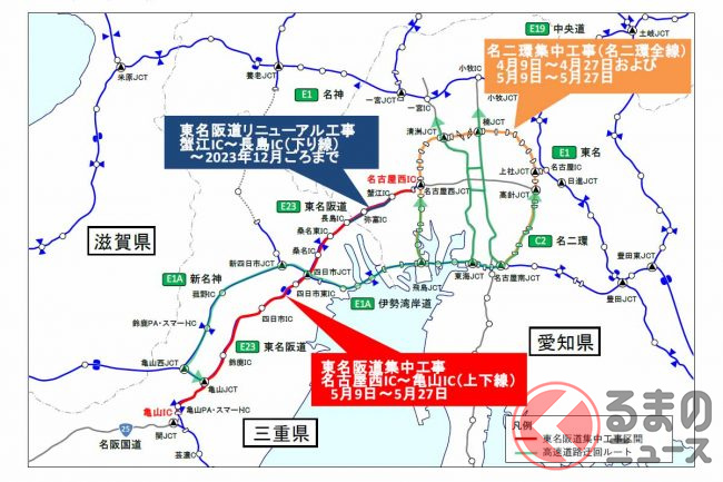 ゴールデンウィーク後、東名阪道のほぼ全線で、集中工事に伴う昼夜連続の車線規制が予定されています。名二環も同期間に同様の計画があり、利用の際は注意が必要です。