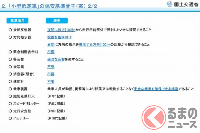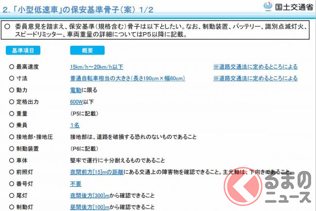 このような実態を踏まえ、当庁の有識者検討会の報告書においては、「一般的な原動機付自転車等と必ずしも同様に扱うことが適当ではないと考えられる場合があることから、最高速度や車体の大きさに着目して車両の区分を定め、それに応じた交通ルールを定めることが適当である」旨の提言がなされたところです。