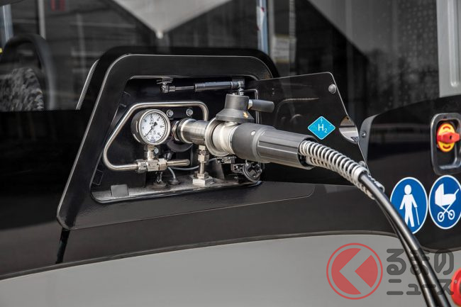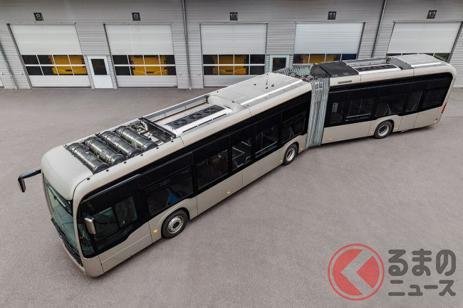また、トヨタの欧州法人はFCスタックを積載した車両(連節バスタイプの「eシターロG」)の画像も公開。屋根に複数本の水素タンクが積載されていることが確認できます。