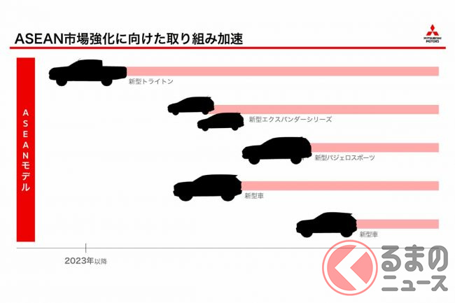 新型車については、新型軽EVや中国向け新型「エアトレック」といった電動化を加速させていくとともに、アセアン市場の強化に向けて2023年度以降、新型の「トライトン」や「エクスパンダー」シリーズ、「パジェロスポーツ」などのモデルを投入していく方針です。