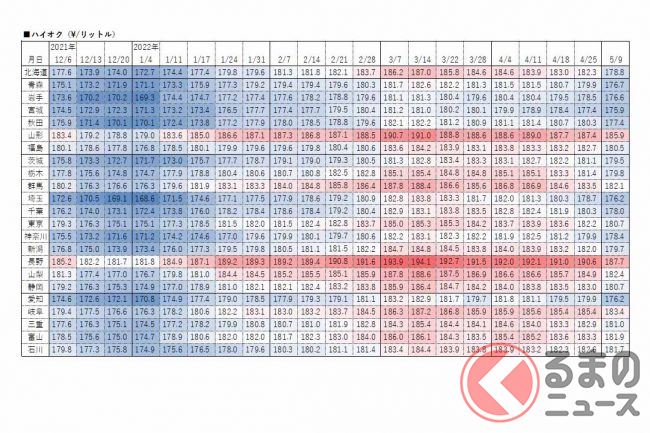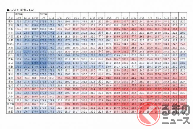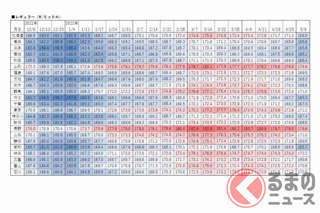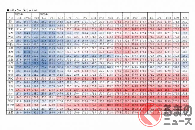 資源エネルギー庁は2022年5月11日、レギュラーガソリンの5月9日時点の店頭価格(消費税込)を発表しました。
