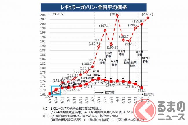 なお、経産省によると、補助金がない場合のレギュラーガソリンの全国平均小売価格は、5月9日時点で1リットル199.8円と算出しており、来週5月16日時点では202.7円に上がると予測しています。