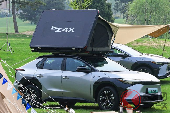 公開された画像では、野原にカーサイドタープやルーフテントを装着した新型「bZ4X」を持ち込み、アウトドアグッズを展開した様子が紹介されています。