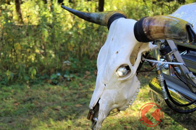 しかし、フロントグリルをよく見ると、ビッグホーンのスカルをかたどった装飾が施されており、なんとその鼻先には火炎放射器が備わっています。