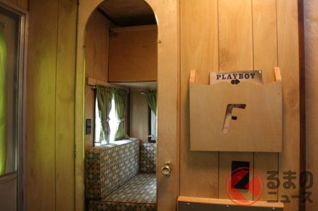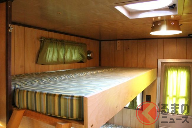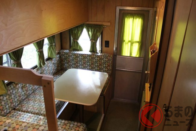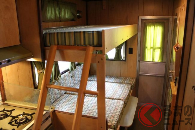 その内部は非常に上品に仕上げられており、1960年代のアメリカを感じさせるレトロ感があります。テーブルとソファは、就寝時には2段ベッドへと切り替えることができ、実用性も十分です。