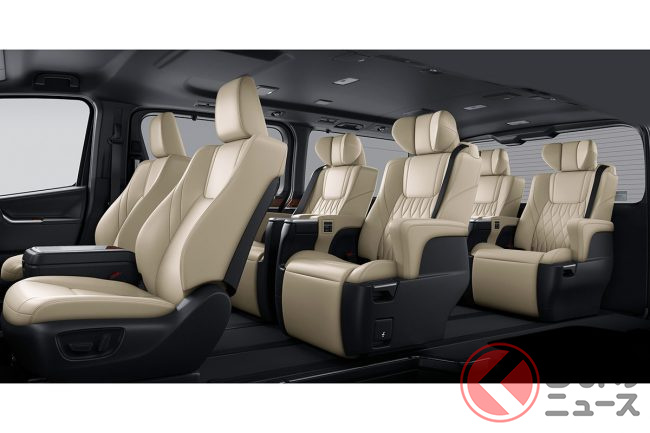 日本向けグランエースには、アルファードではできない4列・8人乗り仕様を設定したり、3列・6人乗り仕様で後ろ2列に大型の専用エクゼクティブパワーシートを贅沢に配置するなど、広大な空間を乗員のために活用しています。