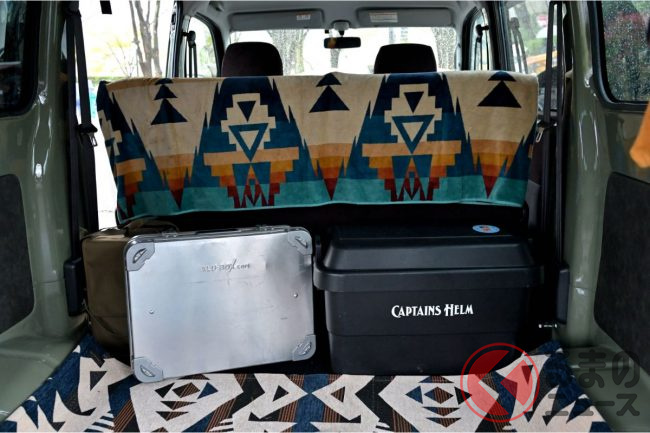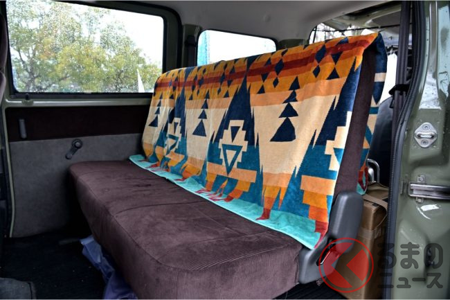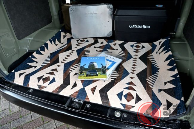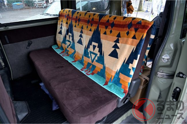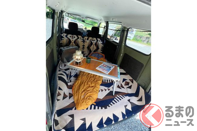 インテリアは現在開発途中となり、シート地を貼り替えてブランケットなどを被せている状態ですが、今回投稿された写真ではブランケットのうえに折りたたみテーブルと寝袋を置けば一気に車中泊仕様に早変わりします。