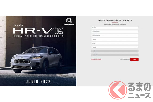 そんななか、メキシコにおける前述のティザーサイトとSNSへの投稿画像を見ると、新型HR-Vの情報を先行して受け取れるフォームのほかに、「JUINO 2022」(スペイン語で「2022年6月」)という記載が確認できます。