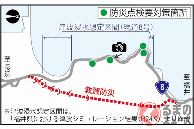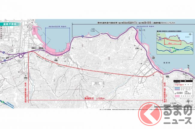 このような課題を解消するため、国土交通省近畿地方整備局は2018年度、海沿いの敦賀市挙野~田結(たい)間をバイパスする長さ3.8kmの敦賀防災事業に着手し、調査・設計などを進めてきました。
