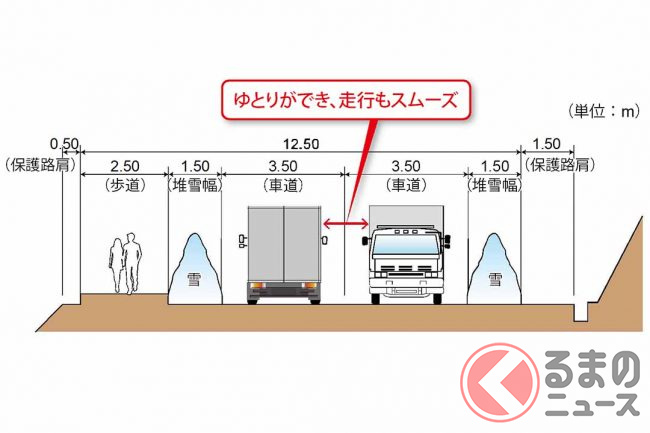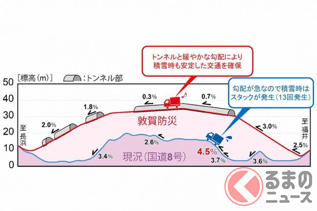 このように急勾配・急カーブ、狭い道幅などが解消されることで、とくに積雪時でも円滑に走れるようになるとともに、災害時の代替ルートとしても機能することなどが期待されています。